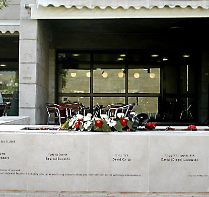 Marla Bennett, from San Diego, CA, a student at the Rothberg International School of the Hebrew University and at the Pardes Institute for Jewish Studies; Benjamin Blutstein, from Harrisburg, PA, also a joint student at Rothberg and Pardes; Dina Carter, from North Carolina, an employee of the Jewish National and University Library at the Hebrew University; Janis Ruth Coulter, from Boston, MA, assistant director of the Office of Academic Affairs of the Hebrew University in New York; David Gritz, from Paris (a French and U.S. citizen), who was about to begin his summer ulpan at the Rothberg School; David Diego Ladowski, from Argentina, a graduate of the Hebrew University who was about to begin a diplomatic assignment for Israel in Peru; Levina Shapira, head of the Student Services Department of the Hebrew University; Dafna Spruch, an employee of the Student Services Department; and Revital Barashi, who worked at the Faculty of Law of the Hebrew University.